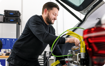 Gründliche Vorbereitung: Fabian Pfeifer stattet Versuchsfahrzeuge vor dem Crashtest mit komplexer Messtechnik aus